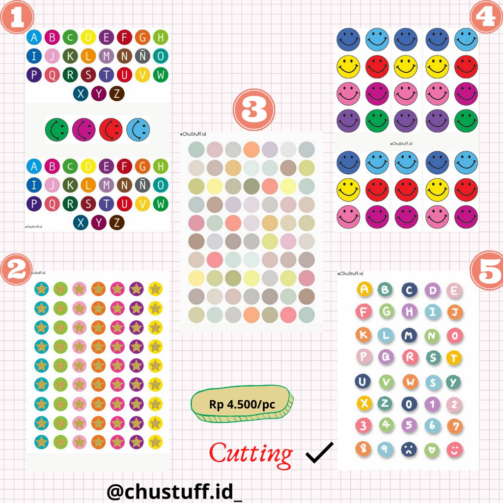 Stiker berbentuk bulat ini terdiri dari 5 varian dan sudah dicutting yaa, jadi sudah tinggal tempel aja ya