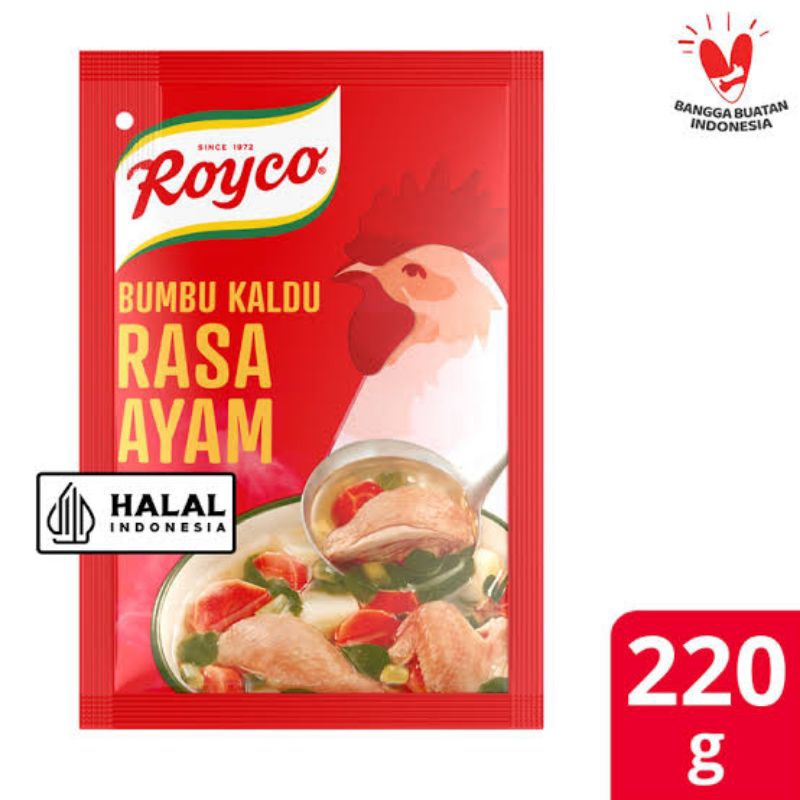 Royco ayam, bumbu penyedap serbaguna yang dapat meningkatkan citarasa masakan Indonesia Anda. Terbuat dari daging ayam dan rempah berkualitas untuk menghasilkan kaldu yang mantap, penuh citarasa. Tambahkan Royco untuk meningkatkan citarasa masakan Indonesia Anda.