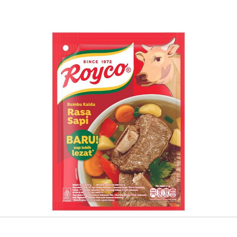 Royco Bumbu Kaldu Penyedap Rasa Sapi 94 g adalah salah satu inovasi bumbu masakan Indonesia berbekal pengalaman panjang selama 30 tahun yang diracik dari bahan-bahan dan rempah pilihan, seperti daging sapi pilihan yang direbus secara baik. Mudah larut dan meresap sehingga membantu memberi rasa kaldu yang mantap pada masakan Anda serta membantu memasak dengan mudah dan menyenangkan.