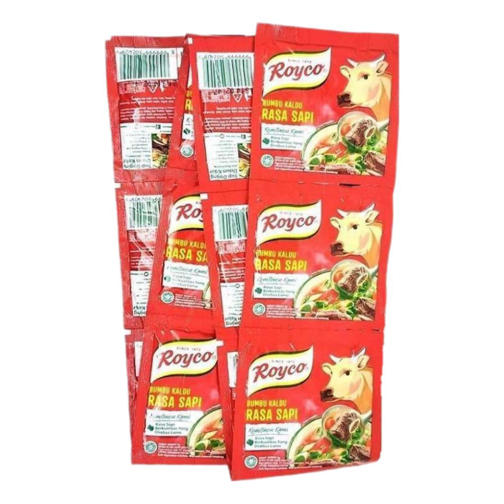 Royco Bumbu Kaldu Rasa Sapi (1 renceng/12 sachet) Bumbu Masak Royco dibuat dengan bumbu dan rempah dengan kualitas terbaik. Anda memerlukan penyedap serbaguna untuk meningkatkan cita rasa masakan Indonesia Anda. Royco sapi dan ayam, bumbu penyedap serbaguna yang dapat meningkatkan citarasa masakan Indonesia. Terbuat dari bahan dan rempah berkualitas untuk menghasilkan kaldu yang mantap, penuh citarasa.