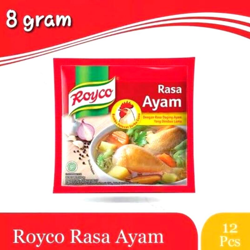 ROYCO AYAM merupakan bumbu penyedap rasa kaldu ayam.Penyedap rasa ini dapat dengan mudah digunakan untuk berbagai macam hidangan, mulai dari masakan tumis, berkuah, sampai yang digoreng. Salah satu penyedap rasa yang mempunyai rasa yang khas adalah Royco Bumbu Kaldu Rasa Ayam. Produk ini merupakan bumbu pelezat masakan yang terbuat dari bahan-bahan dan rempah pilihan, termasuk daging ayam pilihan yang direbus lama. Sehingga memberi cita rasa gurih alami kaldu ke dalam