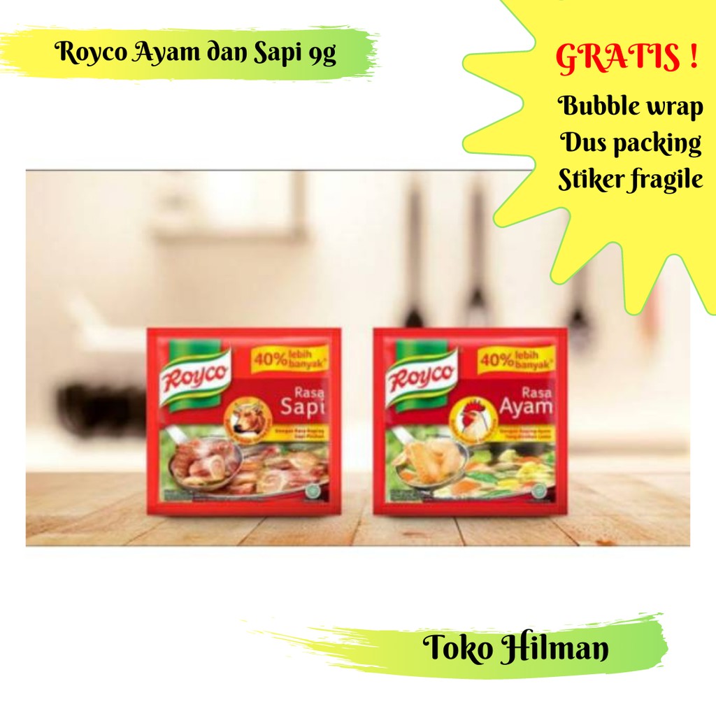 Royco dengan kemasan sachet kecil, lebih mudah menyimpannya dan bisa dipakai kapan saja dan di mana saja. Varian yang tersedia adalah rasa ayam dan rasa sapi.