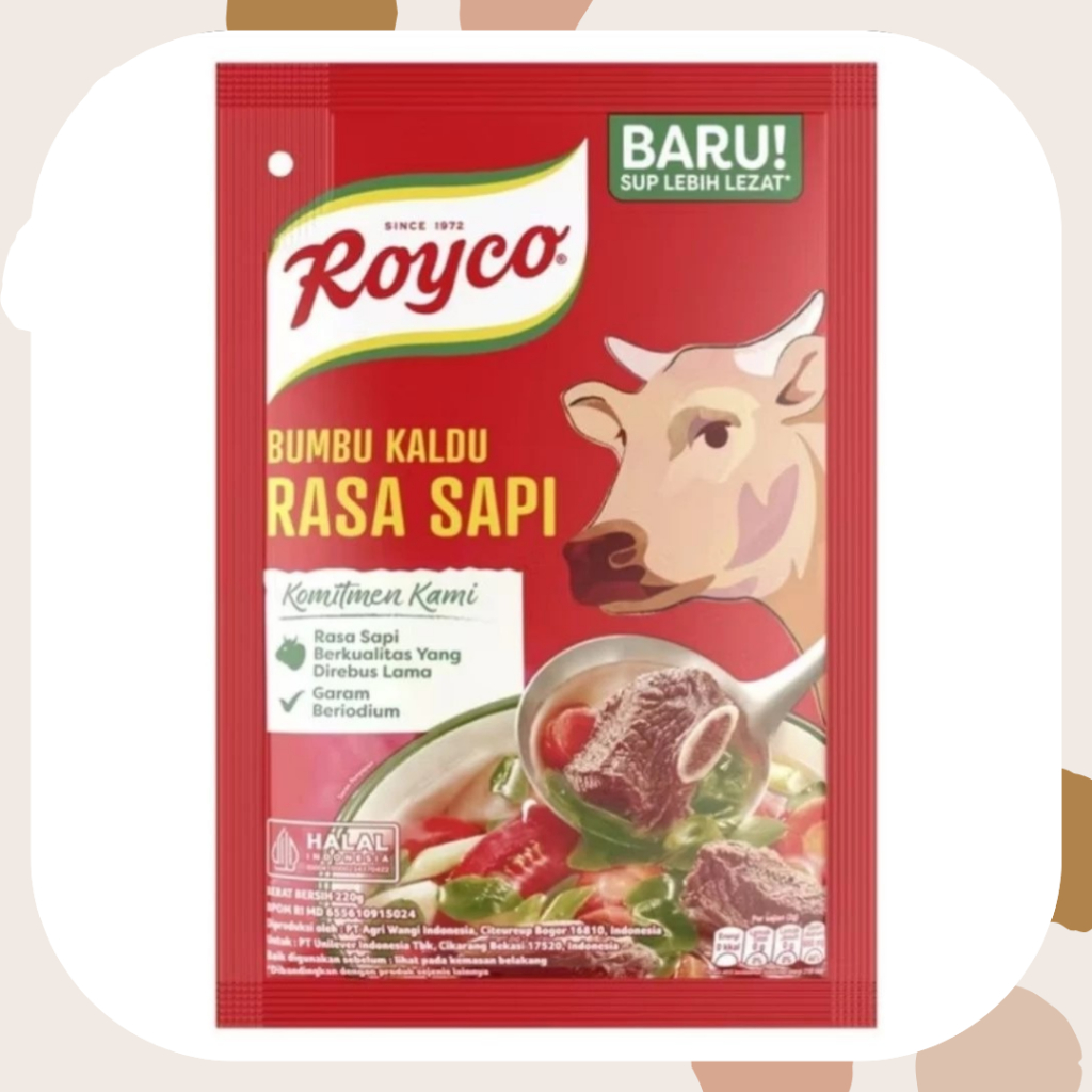 Royco bumbu kaldu ayam & sapi merupakan bumbu kaldu pelezat serbaguna yang terbuat dari bahan-bahan dan rempah pilihan.