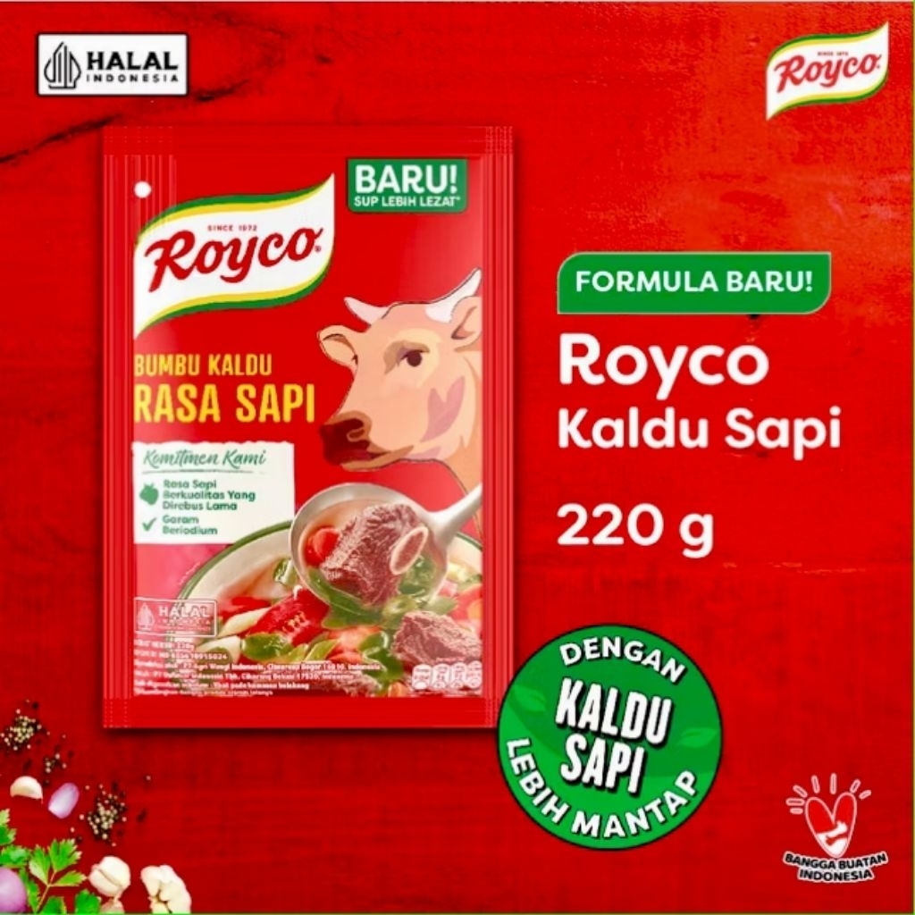 Royco Bumbu Kaldu Rasa Sapi adalah makanan beriodium yang dikemas dalam kemasan 220 g