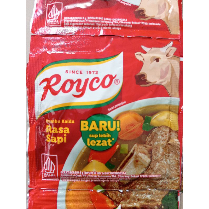 Royco sapi adalah bumbu penyedap rasa yang terbuat dari ekstrak kaldu sapi dan rempah-rempah pilihan. Bumbu ini dapat digunakan untuk berbagai masakan, seperti soto, sop, tumisan, dan gorengan.