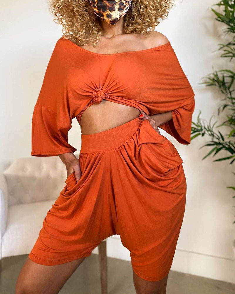Ruched Long Sleeve Solid Top & Short Set, Orange