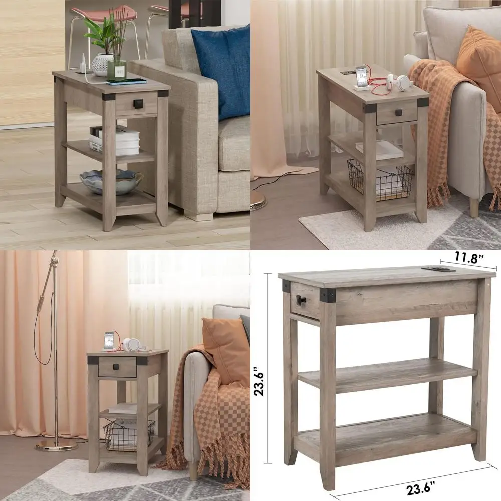 Rustic Grey Slim End Table with USB Charging and Outlets for Small Spaces, Storage Drawer Included