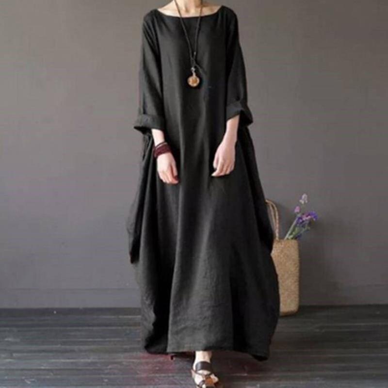 S-XXXXXL Летнее свободное повседневное однотонное платье большого размера из хлопка и льна с рукавами 3/4 в полный рост S чёрный