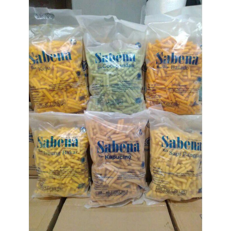 Sabena Snack Merupakan Snack Stick yang terbuat dari bahan baku Jagung dicampur dengan bumbu tabur yang dipotong simetris memanjang