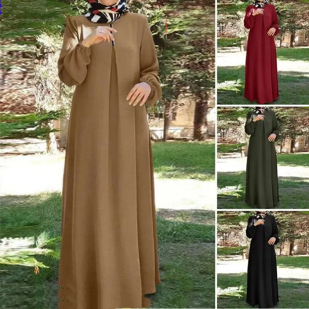 Muslim Women's New Arab Solid Color Ribbon Bubble Sleeve Loose Round Neck Dress Robe Abaya Ramadan Dubai Luxury Islam Elegant