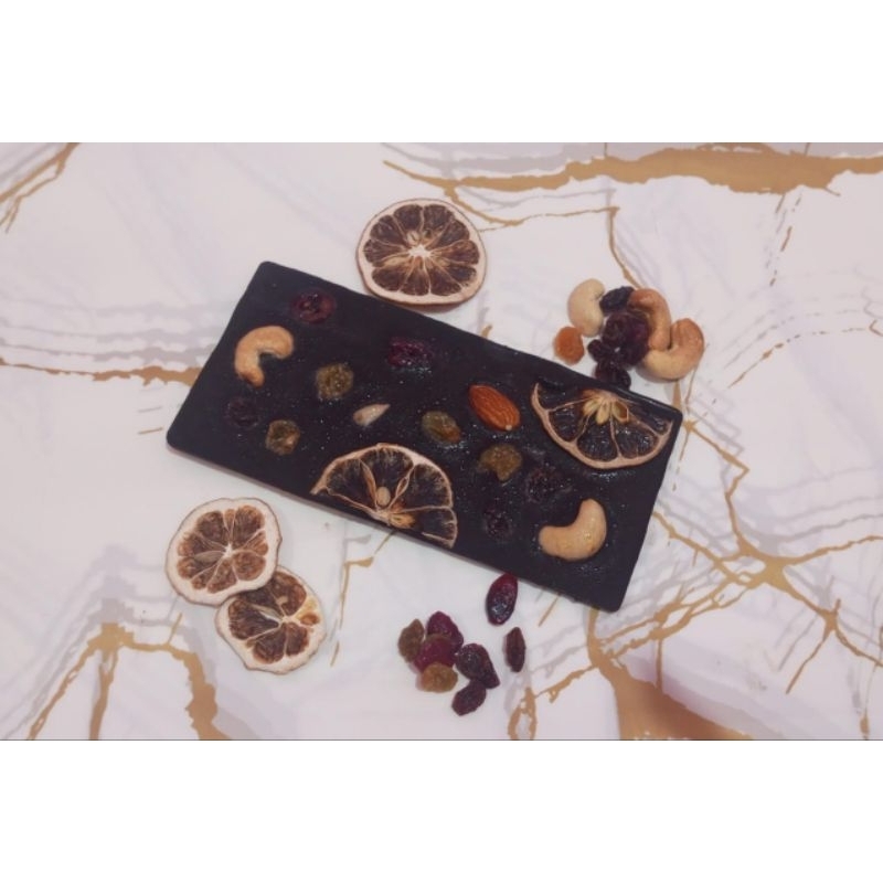 Coklat dengan topping buah - buahan, kacang, dan kismis