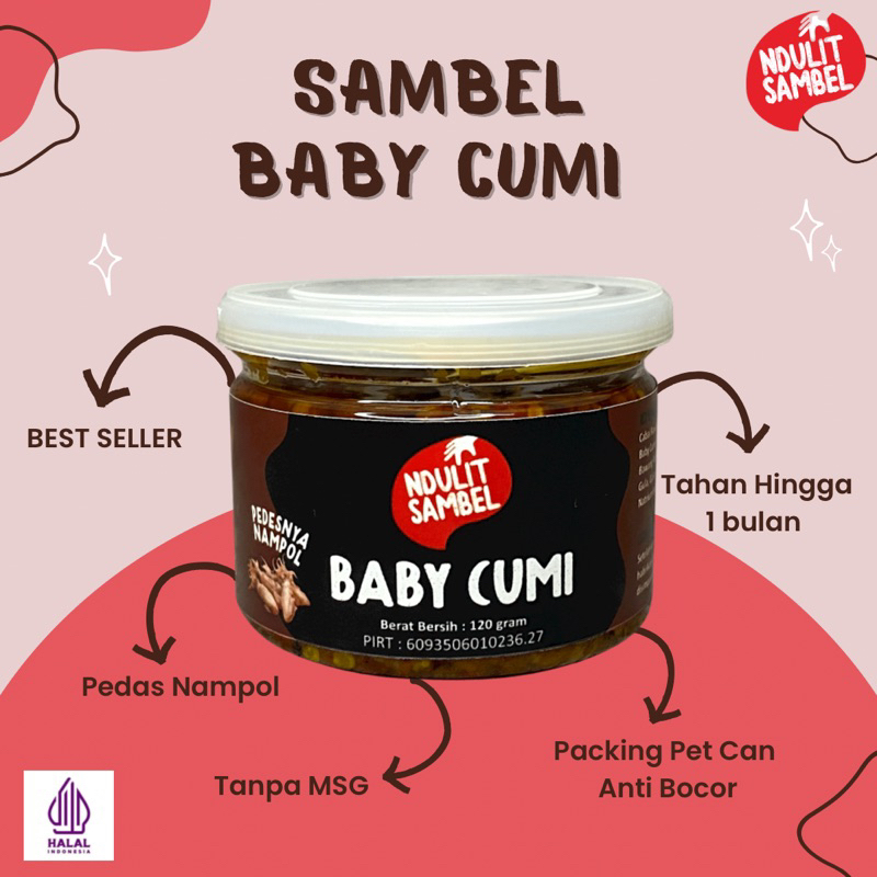 Sambel baby cumi merupakan perpaduan antara sambal bawang dengan baby cumi serta ditambah dengan bumbu pilihan. Aroma gurih cumi yang dapat menggugah selera, sangat cocok dinikmati dengan berbagai jenis makanan. Mudah dibawa kemana saja dan bisa digunakan untuk tambahan masakan sesuai selera.
