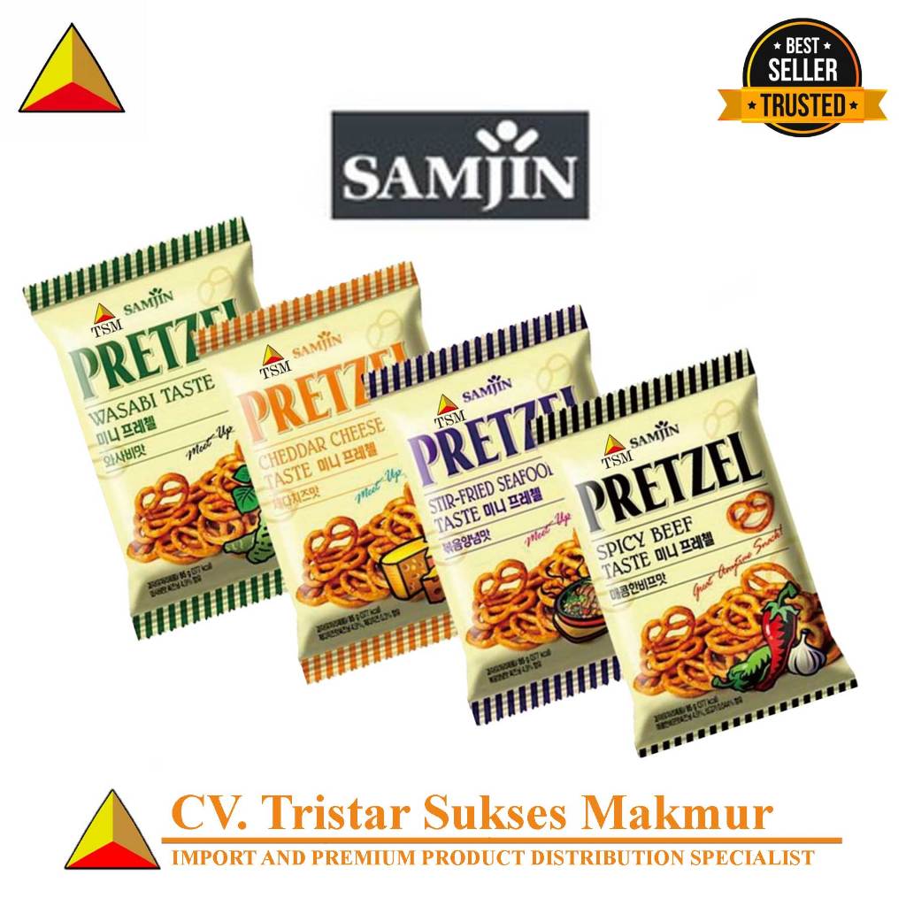 Samjin Pretzel Snack Korea Adalah sejenis kue yang berasal dari eropa. Ciri khasnya adalah bentuknya yang berupa tiga simpul. Rasanya manis sedikit asin. Pretzel ini teksturnya crunchy dan diberi berbagai bumbu yang berbeda ditiap rasanya.