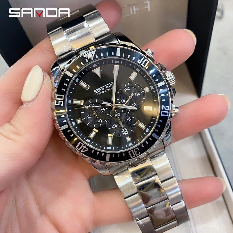 SANDA новые мужские кварцевые часы со стальным ремешком и календарем, простые индивидуальные мужские наручные часы с тремя глазами и шестью иглами, зеленые водные призраки