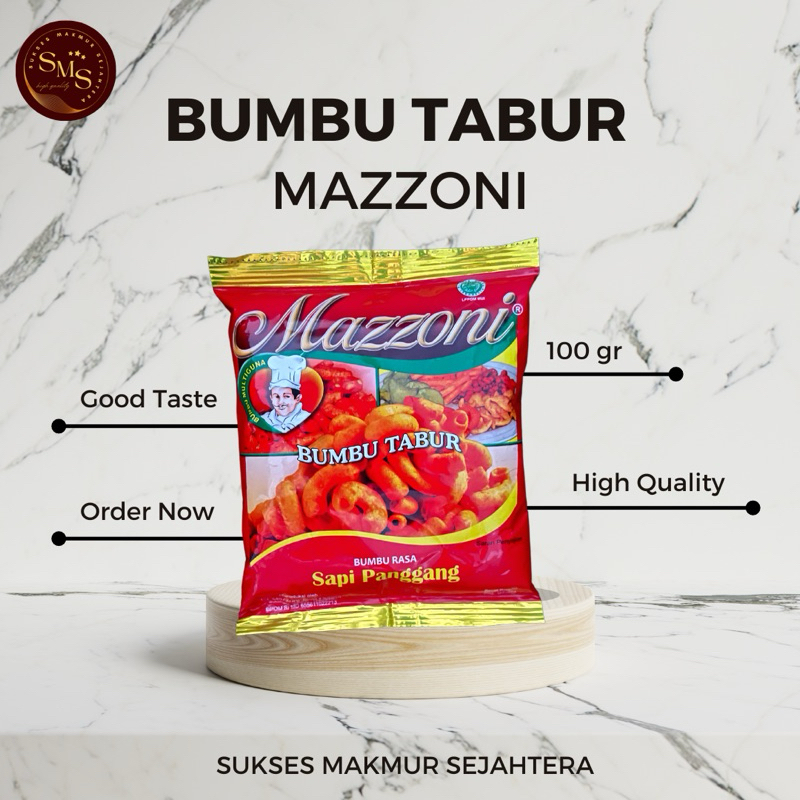 Bumbu Tabur MAZZONI rasa SAPI PANGGANG memiliki aroma khas SAPI PANGGANG dengan warna cerah alami. Diracik dengan bahan baku pilihan yang berkualitas dan diproduksi dengan higienis menjadikan MAZZONI memiliki rasa yang enak dan menjadi pilihan tepat untuk camilan seperti keripik, kerupuk, aneka gorengan, dan bakaran.