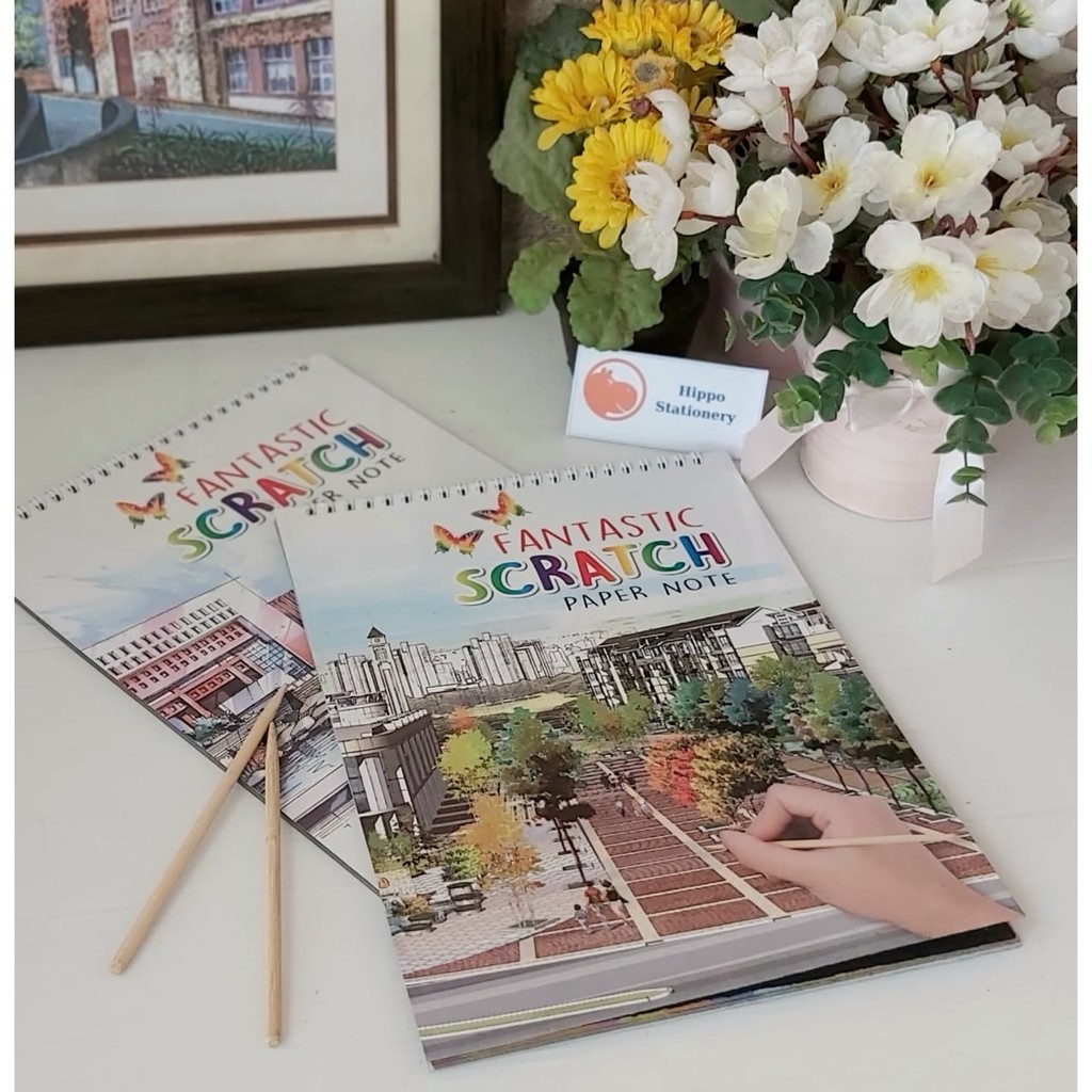 Jika digambar dengan pensil kayu khusus (termasuk dalam paket) maka akan menghasilkan goresan berwarna warni yang menakjubkan.