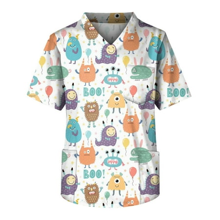 Umitay Navy Blue Scrubs Plus Size Halloween Printed Scrub Working Uniform Tops For Men s Cross V-Neck Short Sleeve Fun T-Shirts Workwear Tee With Pockets
