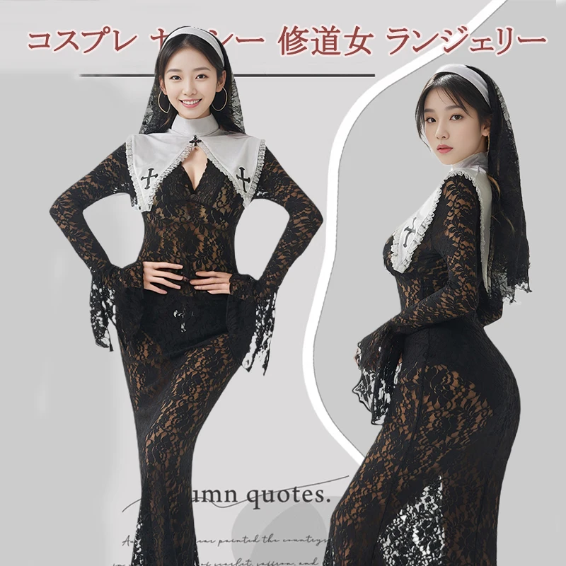SENMHS Новая монахиня, косплей, черное кружевное прозрачное платье макси с цветочным принтом, вечерние платья на Хэллоуин, нижнее белье для сестры, тематическая праздничная одежда