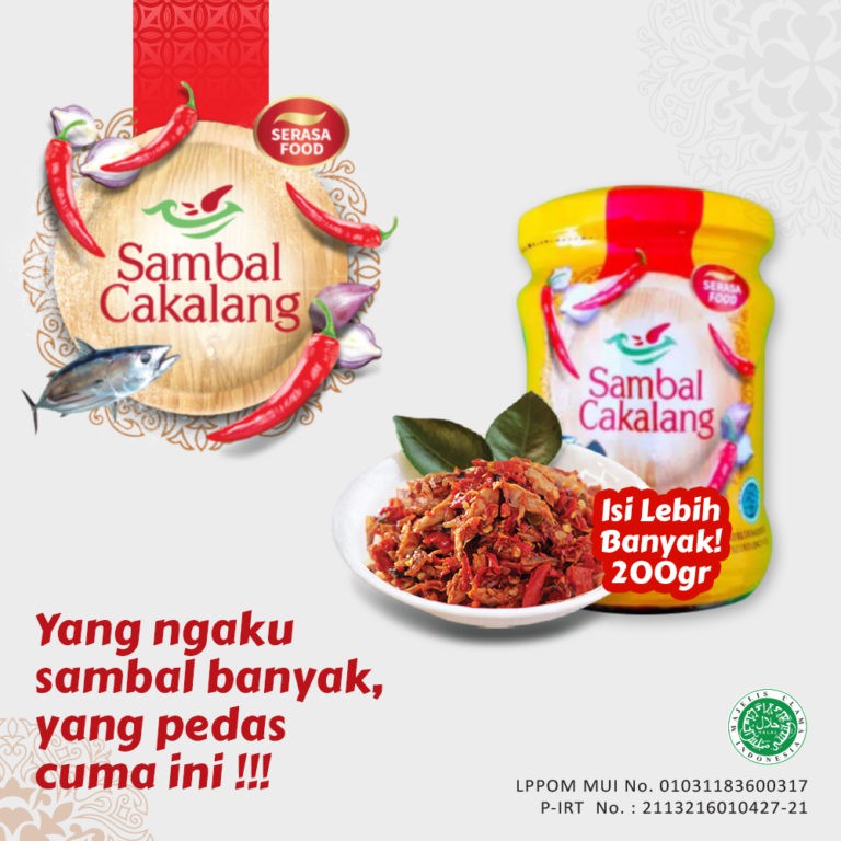 Serasa Sambal Cakalang adalah sambal yang dibuat dari ikan cakalang segar dan cabai rawit pilihan serta bahan pilihan lainnya. Diproduksi oleh serasa food dengan teknologi modern, rasa sambelnya lebih enak, isi lebih banyak, masa simpan lebih lama dan harganya ekonomis.