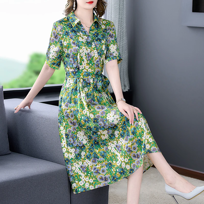 Women Ruffled Neck Butterfly Short Sleeve Flower Printed 100% Cotton Midi Dress