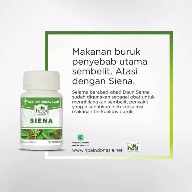 Siena (Jati Cina) merupakan herba suplemen dari Daun Senna (casia angustifolia folium), yang dibuat secara khusus sehingga memberikan efek cepat bereaksi terhadap tubuh.