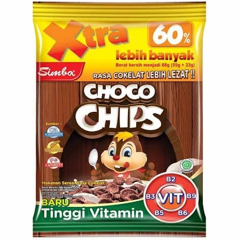 Simba Choco Chips Bag adalah sereal rasa cokelat berbentuk kerang (shell) yang terbuat dari bahan bahan berkualitas yang mengandung Kalsium , Iron, Vitamin, dan Serat.