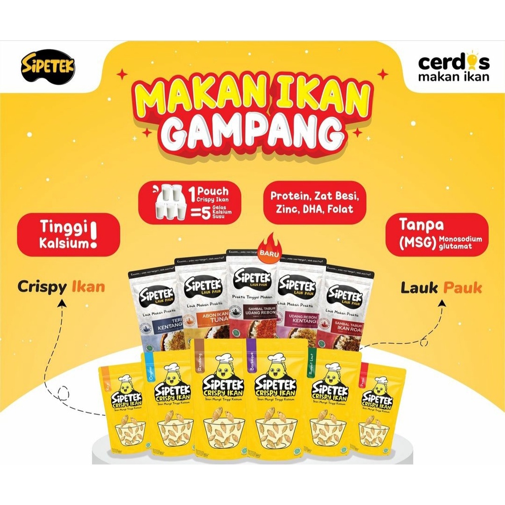 SIPETEK Crispy ikan adalah ikan goreng berukuran mungil yang renyah dan kriuk cocok untuk cemilan maupun lauk makan. Terbuat dari ikan petek danau yang memiliki kandungan kalsium dan protein tinggi, sangat baik untuk pertumbuhan dan tumbuh kembang anak. Dibuat khusus tanpa MSG dan tanpa pengawet. Memiliki varian rasa original, pedas, keju, barbequ, dan rendang.