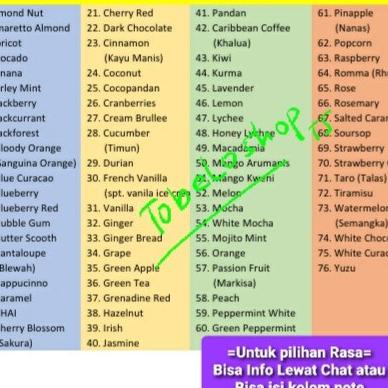 Almond, Avocado, Banana, Bubble Gum, Capucino, Chocolate, Cocopandan, Durian, Grape, Orange, Ocha, Caramel, Vanila, Hazelnut, Mocha, Tiramisu, Mojito Mint, Irish, Rum, Blue Curacao, Green Apple, Kalua, Kiwi, Lychee, Strawbery, Mango, Melon, Blueberry, Peach, dll