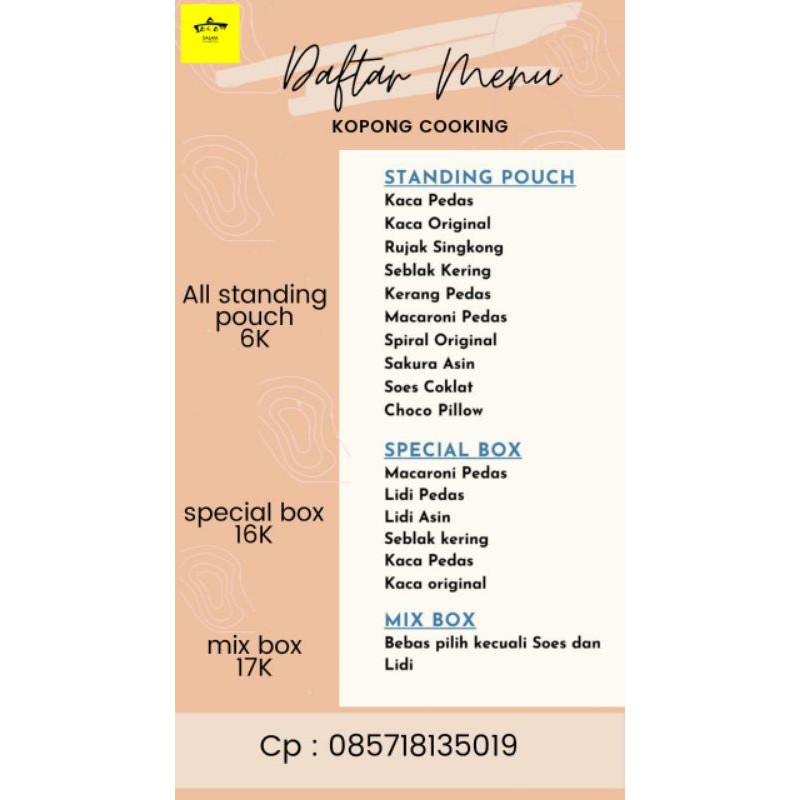 ✨Kopong cooking menyediakan banyak varian snack yang pasti nya akan menggiurkan lidah anda.