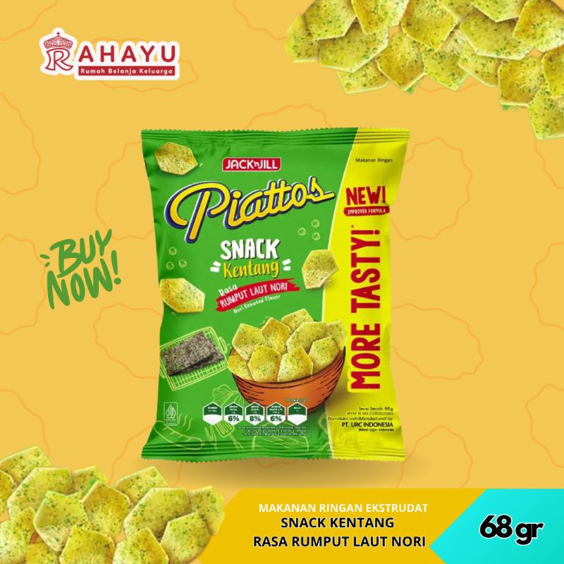 Piattos Rasa Rumput Laut adalah camilan keripik kentang berbentuk segi enam yang memiliki rasa rumput laut yang lembut dan aroma laut yang segar. Camilan ini terbuat dari kentang pilihan yang diiris tipis dan dipanggang