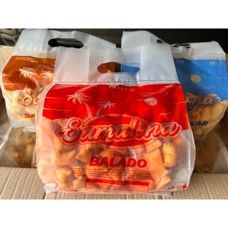 Samalona. Cemilan kriuk Rasa balado, jagung bakar, sapi panggang. Berat 315g.
