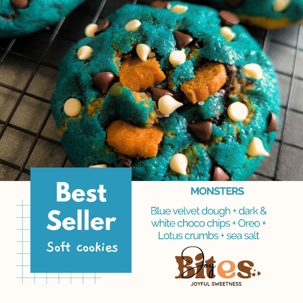 • Monsters (blue velvet dough + dark choco chips + oreo+ cookies crumbs)