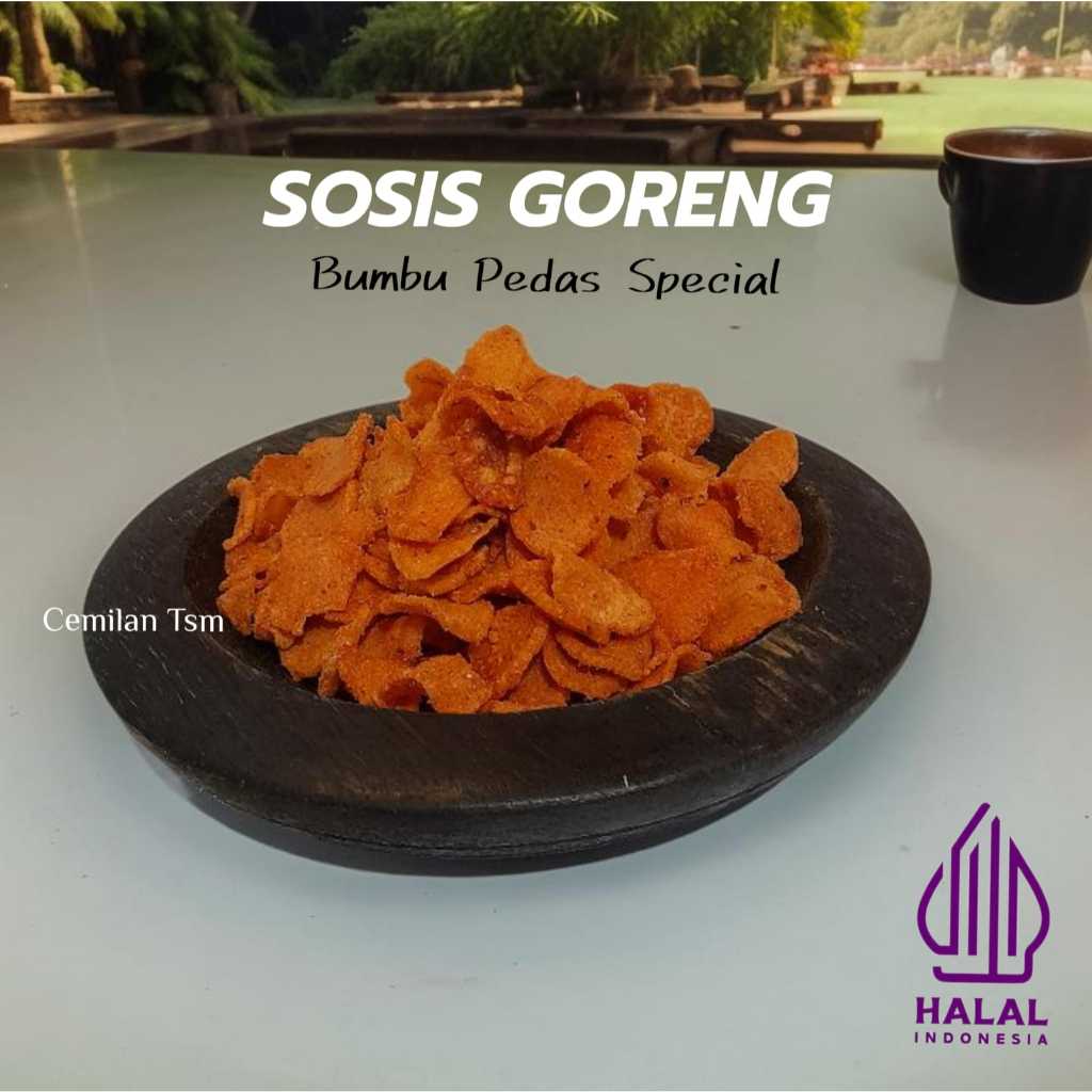 SosisGoreng Adalah Makanan ringan dengan bahan dasar utama Tepung Tapioka yang dicampur dengan ikan laut, Diproduksi dipabrik sendiri, dibentuk seperti sosis yang dipotong potong, Diberi penyedap rasa dan bumbu rempah sambal balado pedas yang memberikan Rasa Pedas Gurih Manis.