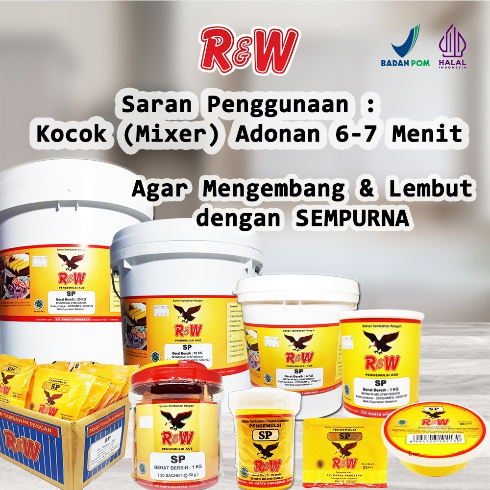 Emulsifier SP Ovalet TBM Rajawali R&W RW digunakan sebagai cake emulsifier yang menjadikan adonan homogen dan tidak mudah turun saat dikocok.