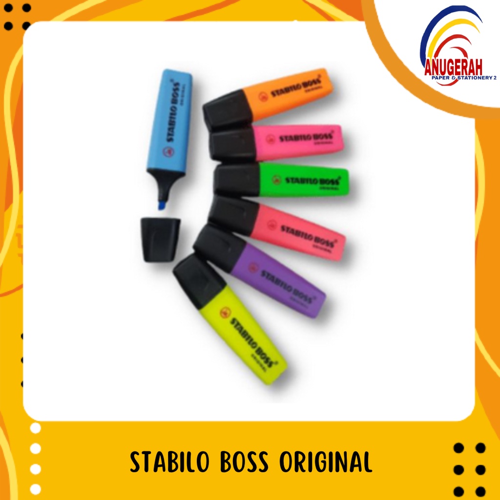 - STABILO BOSS Original dilengkapi teknologi Anti-Dry-Out, produk tidak kering walau dibiarkan terbuka tanpa penutup selama 4 jam. Sehingga pada waktu belajar tidak usah repot membuka-tutup highlighter-mu!