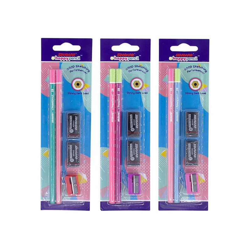 Blister Happy Pencil per set yang isinya terdiri dari : Pencil 2B Happy Pencil 2 batang, Eraser Standard isi 2 pcs dan rautan (colorful sharpener) 1 pc dengan warna yang menarik serta easy to grab untuk konsumen terutama untuk segmen anak sekolah.