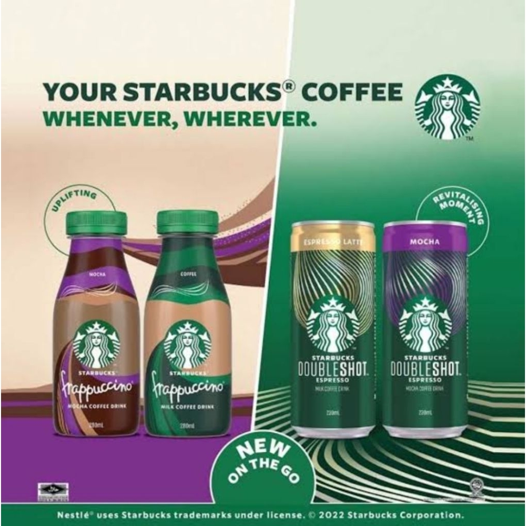 minuman kopi susu Starbucks Frappuccino dalam kemasan botol siap minum. Frappuccino adalah minuman kopi dingin yang dicampur dengan es dan bahan-bahan lain seperti sirup rasa, lalu biasanya diberi krim kocok. Minuman ini merupakan kombinasi antara kopi dan susu yang manis dan creamy, cocok untuk dinikmati kapan saja.