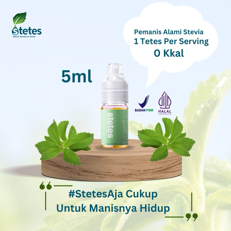 Stetes Stevia merupakan PEMANIS ALAMI yang terbuat dari 100% ekstrak daun stevia sebagai bahan utamanya dan air. Tanpa penambahan bahan kimia maupun Pemanis Buatan. Daun Stevia sendiri sering dikenal sebagai daun gula, daun madu, sweet leaf dan sebagainya. Kandungan yang dimiliki sangat baik, 0 Sugar, 0 kalori namun memiliki tingkat kemanisan hingga 300x lipat lebih manis dibandingkan dengan gula tebu.