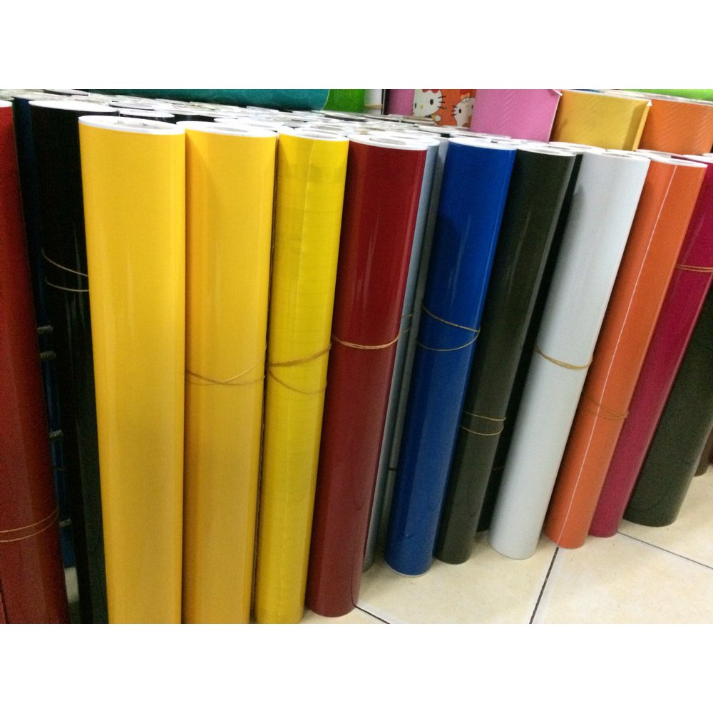 Stiker polos warna biru dof tua (kiri) dan biru dof muda atau biru pos (kanan) merk Profix atau Dc-fix lebar 45cm.