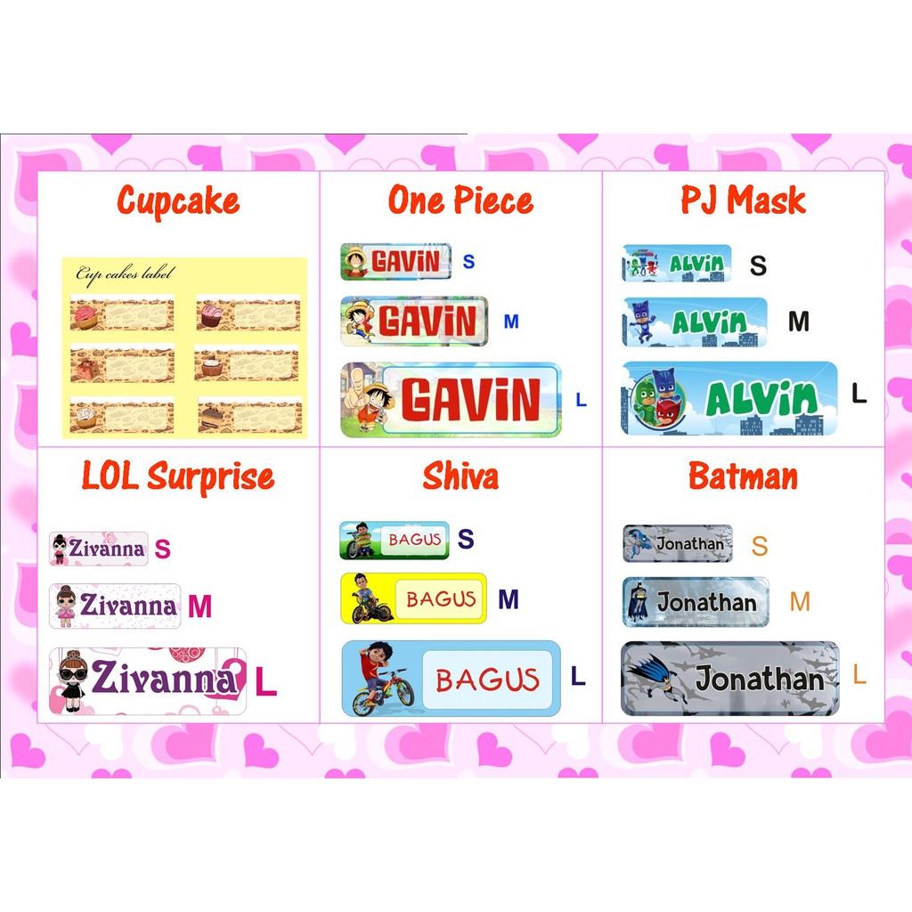 STIKER STICKER LABEL NAMA WATERPROOF BASIC: CUPCAKE ONE PIECE PJ MASK LOL SURPRISE SHIVA BATMAN