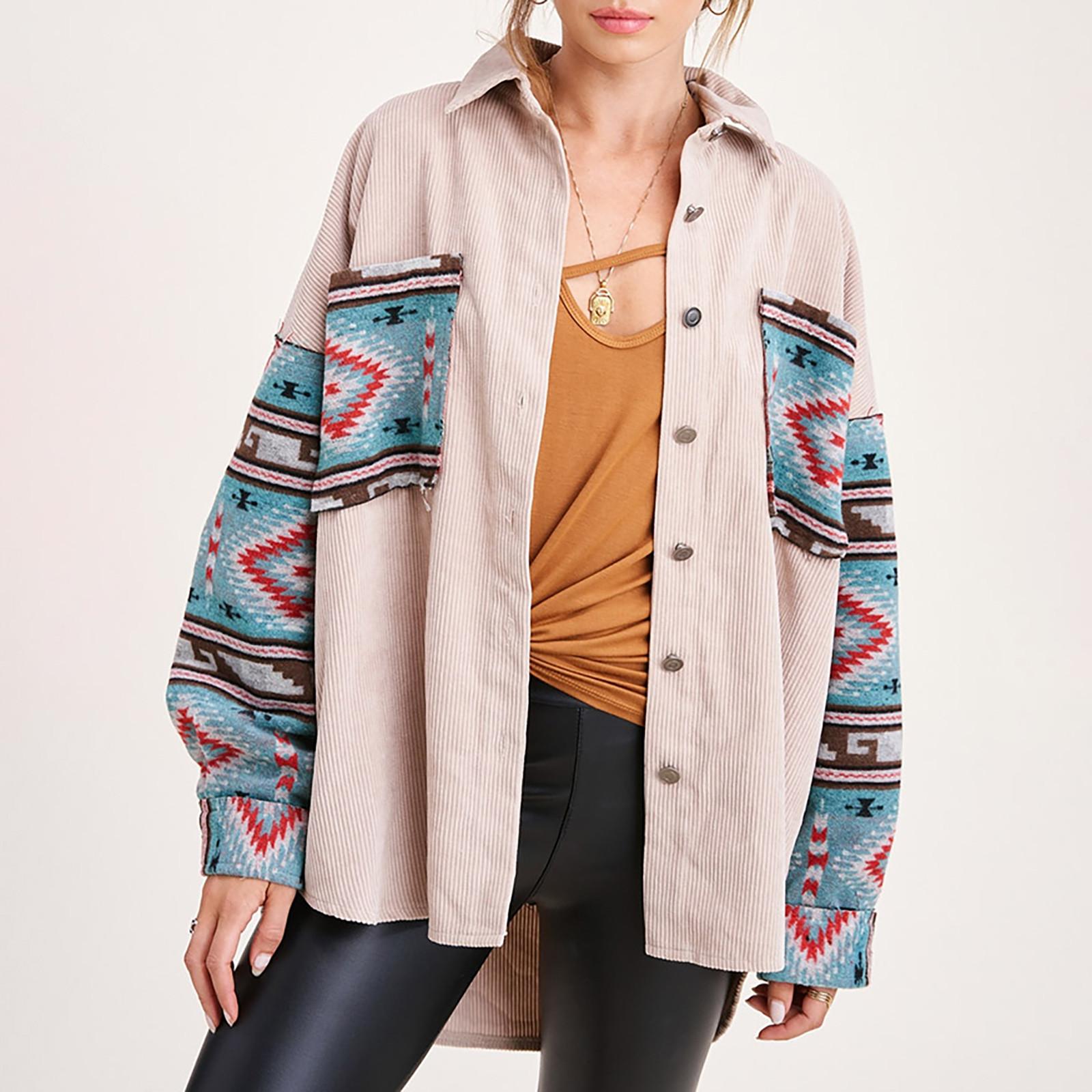 (SU)Женская повседневная модная осенне-зимняя вельветовая куртка с карманами и длинными рукавами с принтом