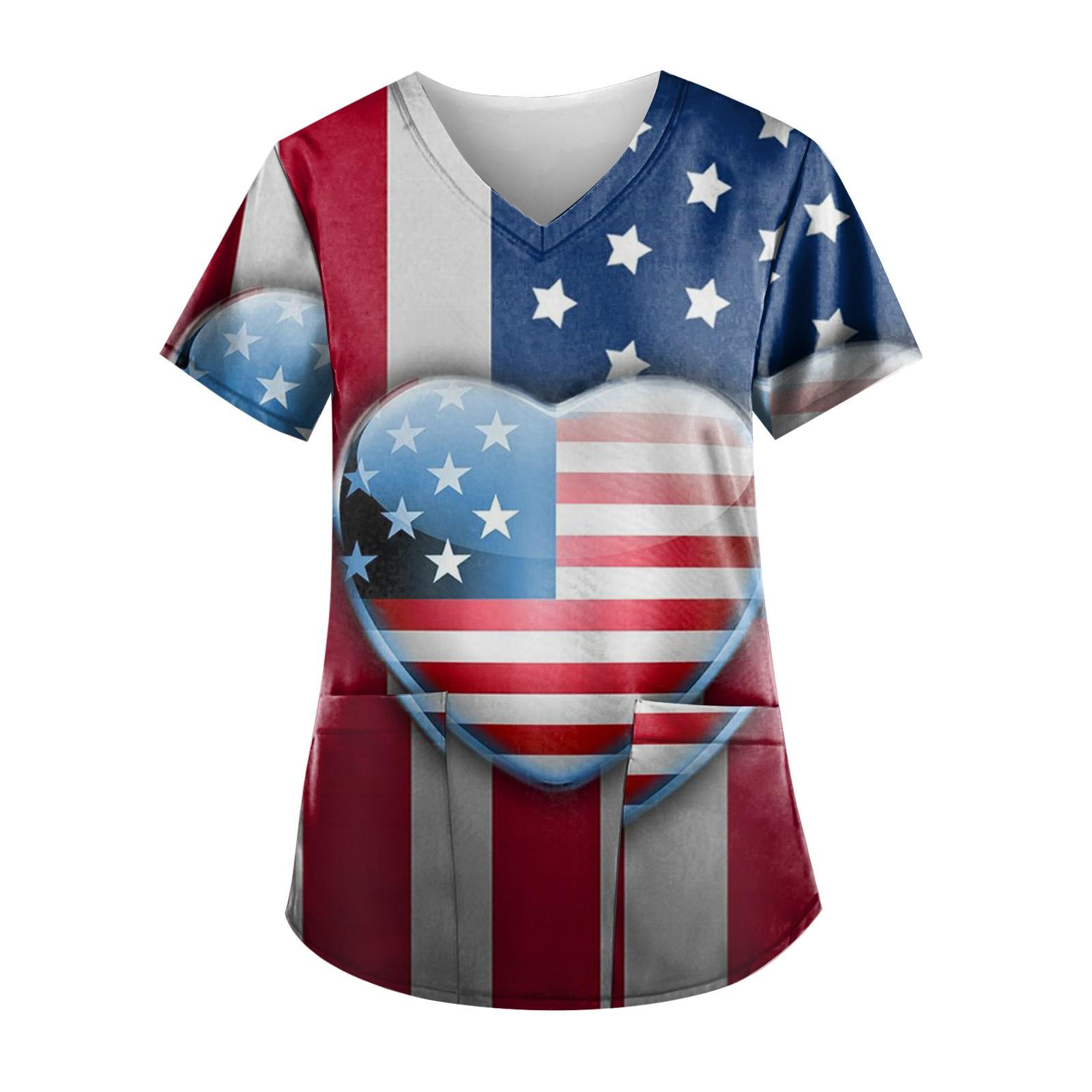 (SU)Женская повседневная футболка с v-образным вырезом и принтом больших размеров на День независимости с карманами XXL синий