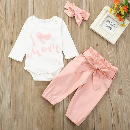 RPVATI Infant Baby Toddler Clothes Long Sleeve Letter Printed Bodysuit + Bowknot Pants Headwear 3 Pieces Fall Winter Clothes