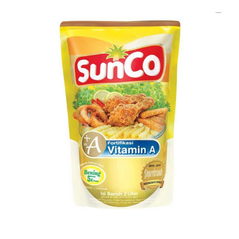 SunCo Minyak Goreng 2 L adalah minyak goreng masak yang diproduksi dari buah kelapa sawit segar pilihan dan difortifikasi dengan vitamin A. Diproses dengan teknologi mutakhir melalui 5 tahap pemrosesan, yakni 3 kali proses pemurnian dan 2 kali proses penyaringan sehingga menghasilkan minyak goreng yang baik dan berkualitas.