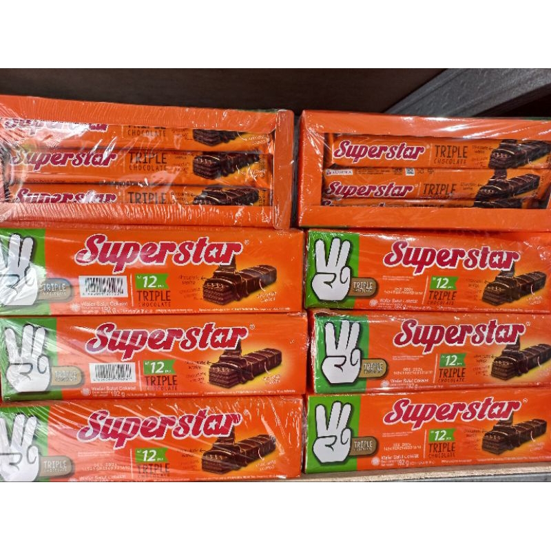 Superstar triple chocolate isi 6, wafer rasa cokelat. Chocolate wafer, chocolate cream, chocolate coated.