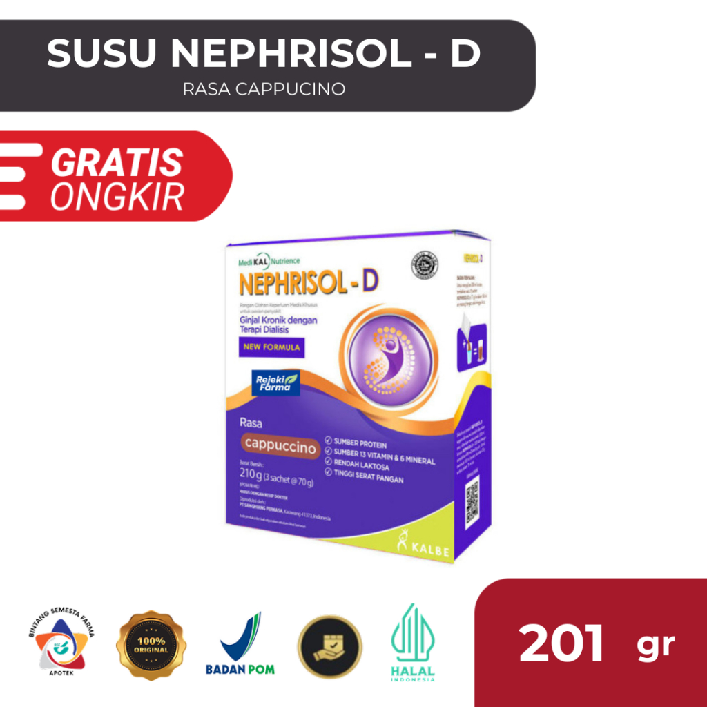 Nephrisol-D adalah nutrisi khusus bagi pasien gagal ginjal dengan tahap Dialisis/CAPD. Selain membuang zat yang tidak perlu pada saat HD, HD juga membuang sebagian protein dan zat penting tubuh lainnya. Dengan menggantinya dengan Nephrisol-D, dimaksudkan agar tetap menjaga keseimbangan mikronutrien juga makronutriennya terutama protein.