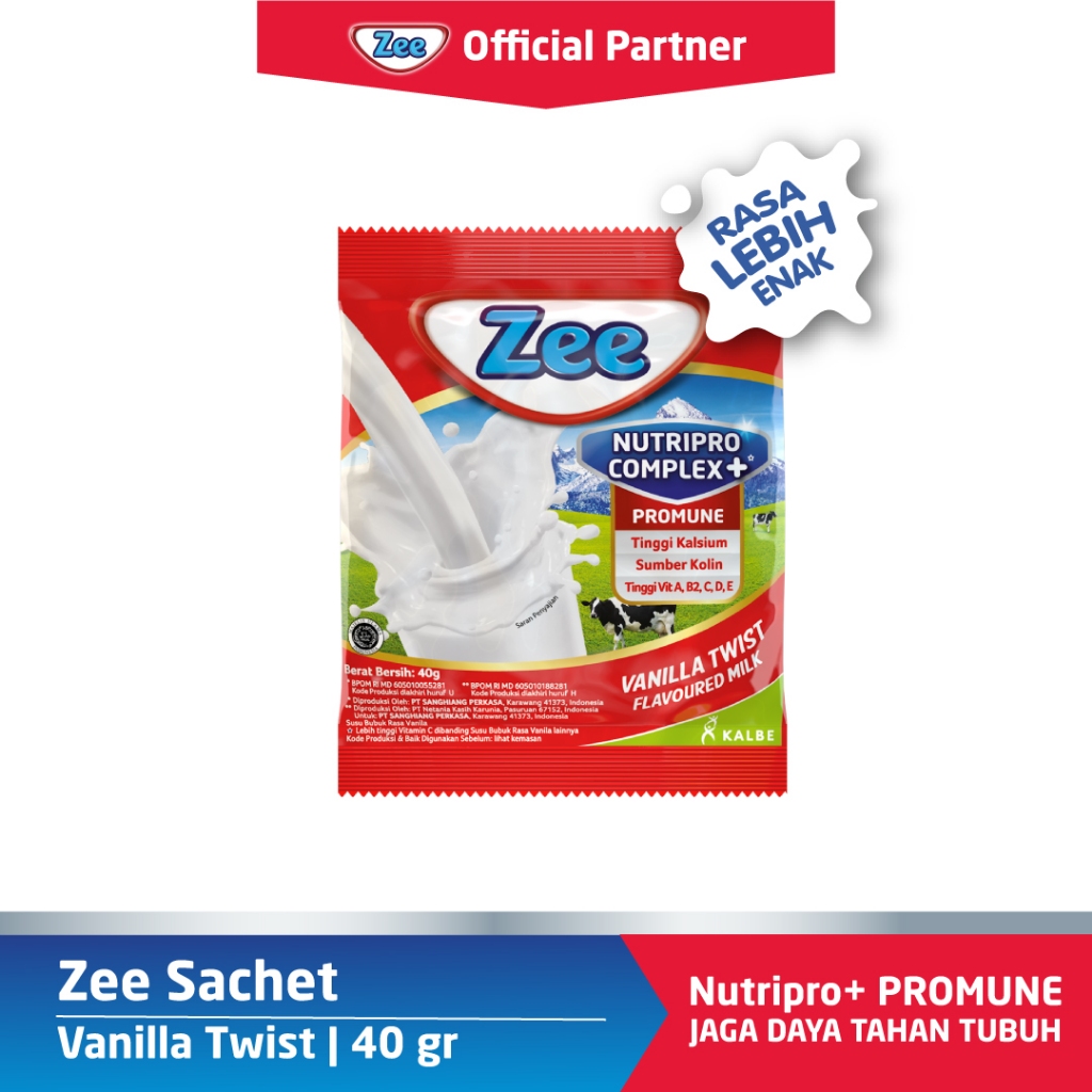 Zee Sachet Swizz Chocolate / Vanilla Twist merupakan susu bernutrisi untuk anak usia 3-12 tahun dibuat dari susu bubuk berkualitas dengan Nutriprocomplex + Promune Formula. Dilengkapi dengan Kolin, Protein, Tinggi Kalsium, 12 Vitamin & 5 Mineral, nutrisi tepat untuk mendukung pertumbuhan dan menjaga daya tahan tubuh anak dan keluarga. Zee ini dikemas dalam kemasan sachet sehingga lebih higenis dan memudahkan untuk dibawa kemana saja.
