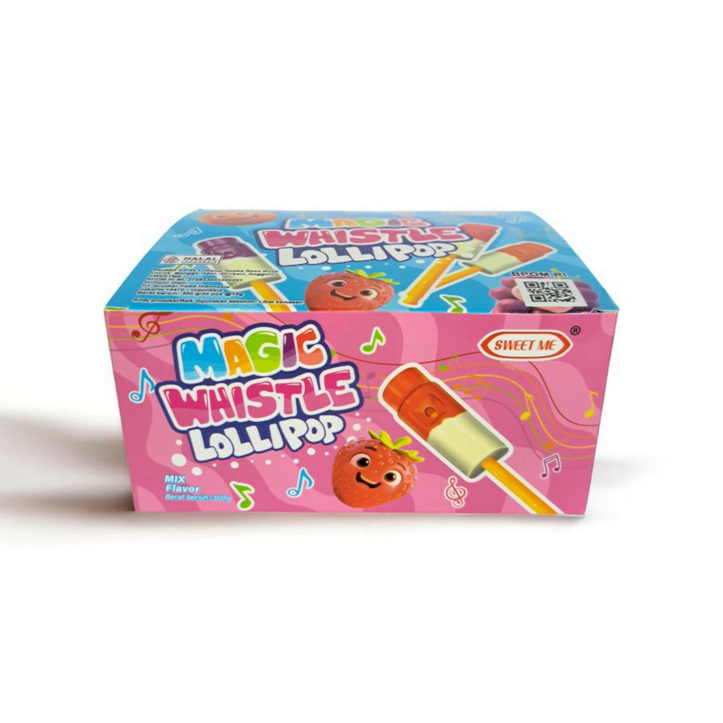 SWEET ME Magic Wistle Lollipop adalah permen keras lollipop berbentuk peluit aneka rasa buah (Jeruk, Mangga, Apel, Stroberi, Anggur)