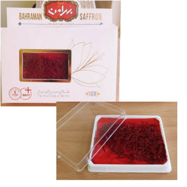 Saffron Iran/Parsia, Grade 1 Brand Bahraman. ( top negin/saffron lebih tebal dan panjang) Kemasan Box Mika