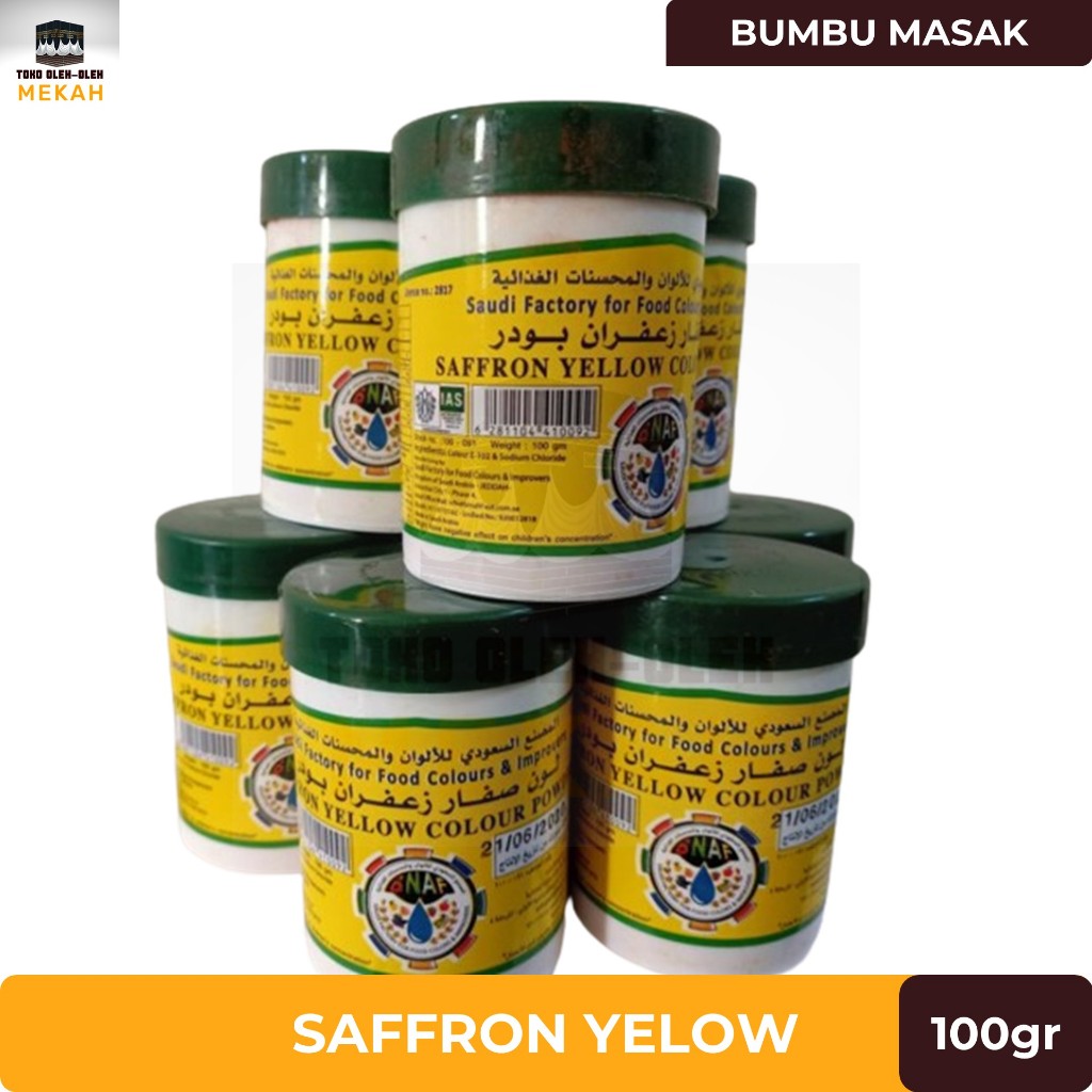 Saffron bubuk warna kuning 100gr untuk pewarna makanan alami, biasanya untuk Biryani dll. Produk original dari Saudi Factory for Food Colours & Improvers.